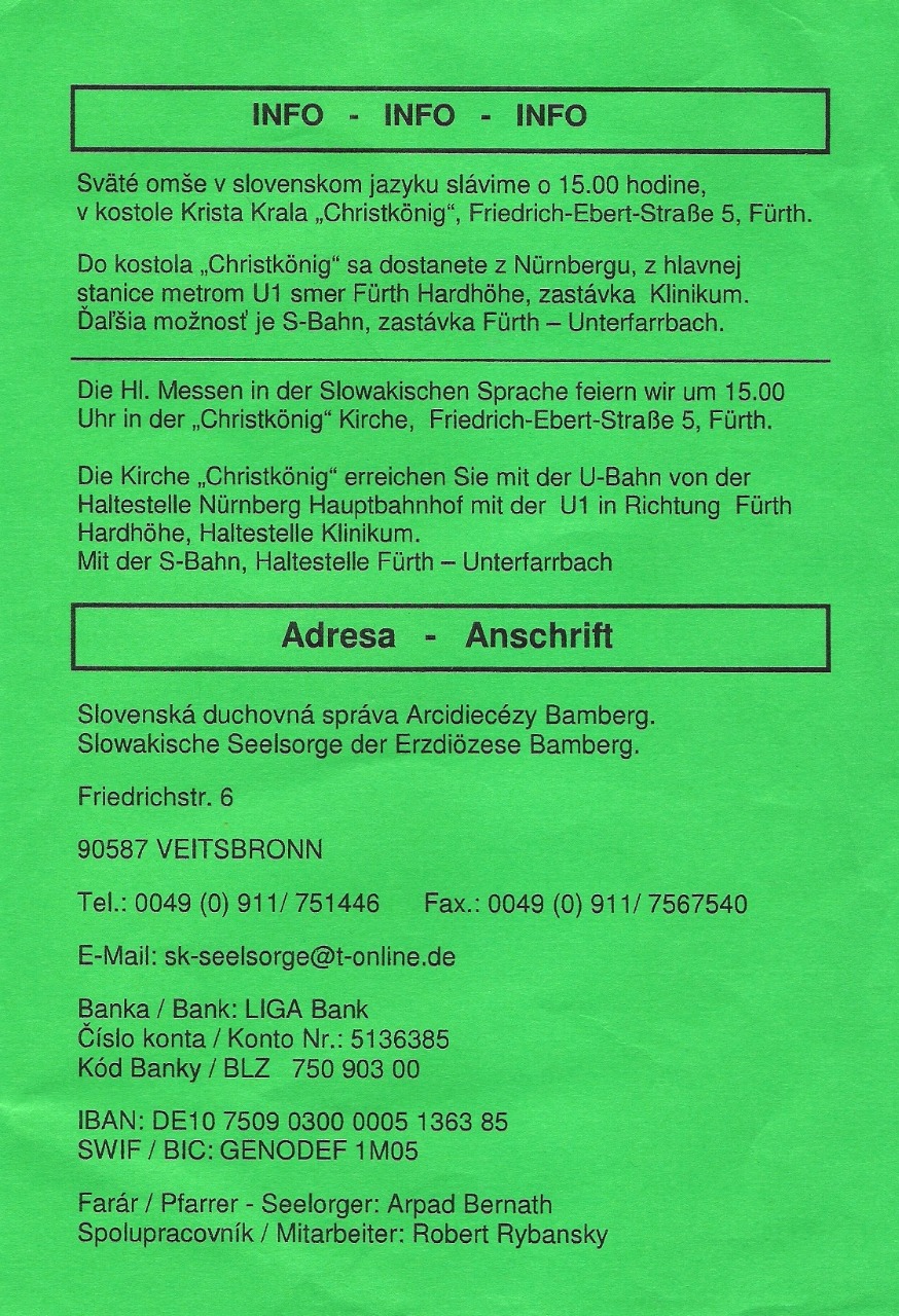 Svätá omša býva v kostole Krista Kráľa "Christkönig", Friedrich-Ebert-Strasse 5, Fürth.